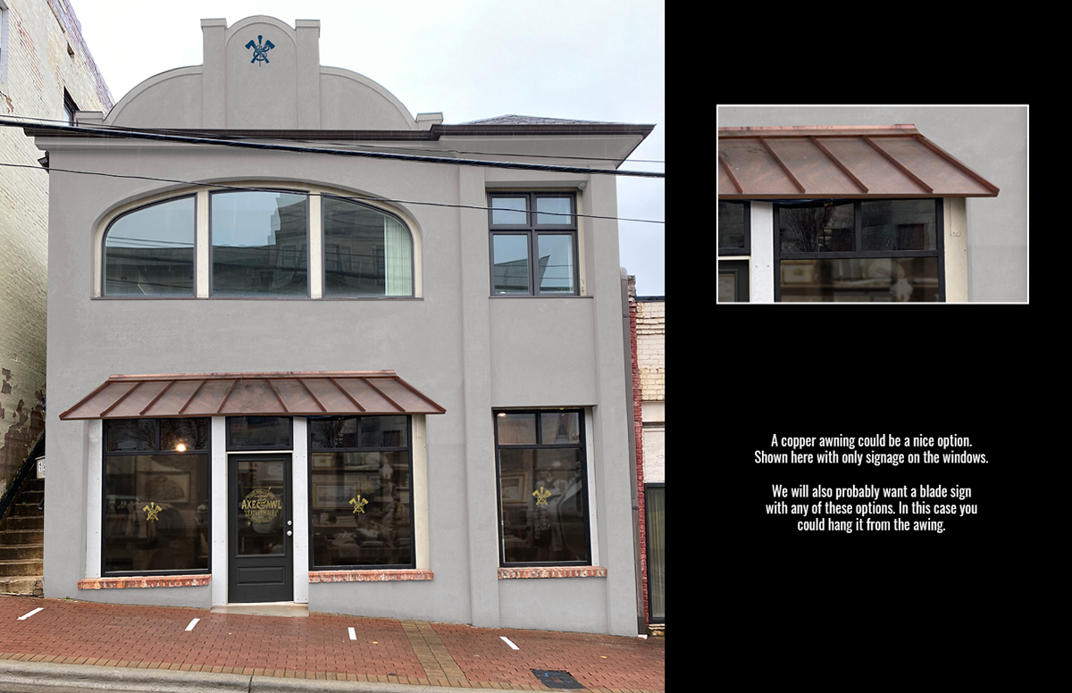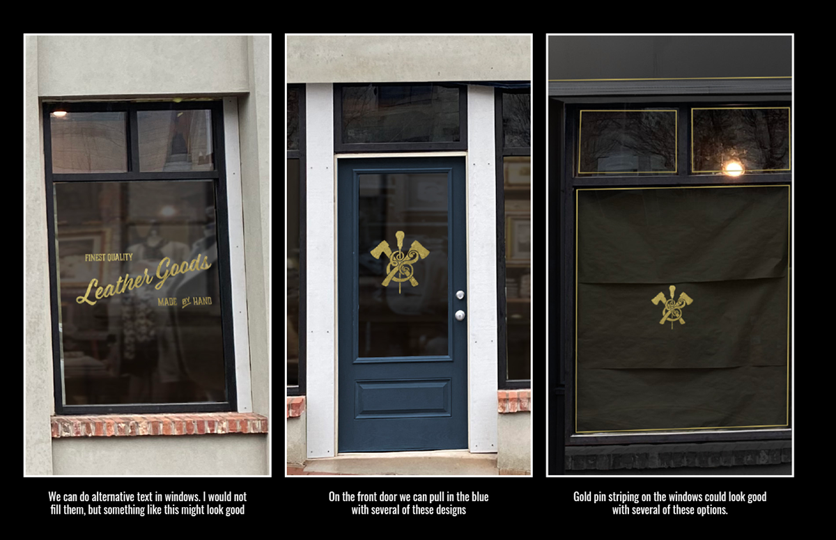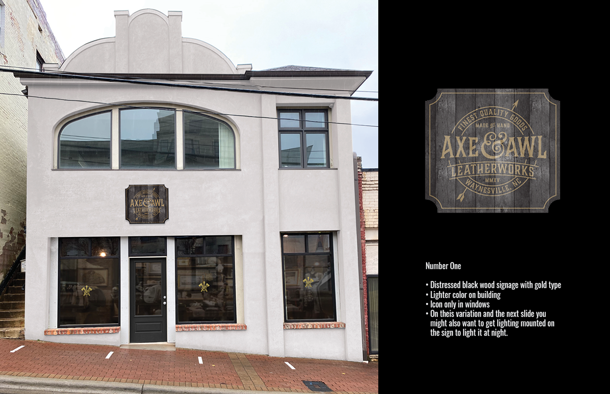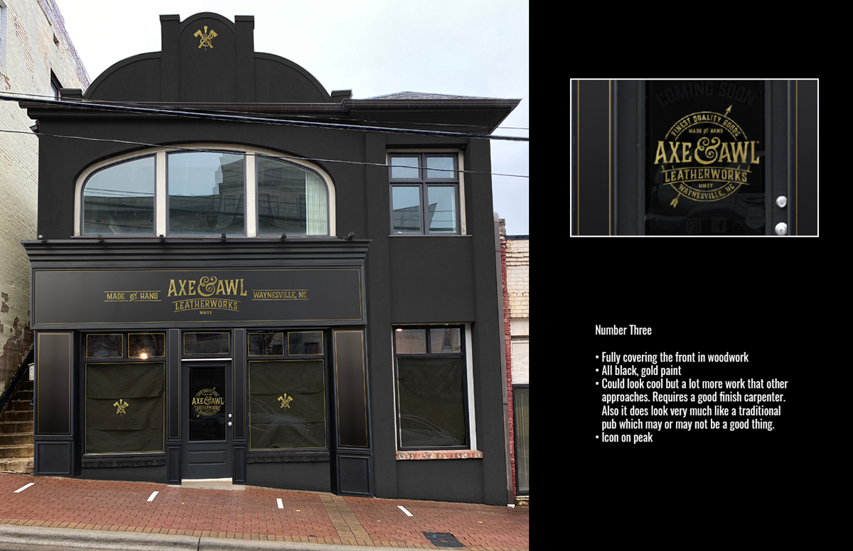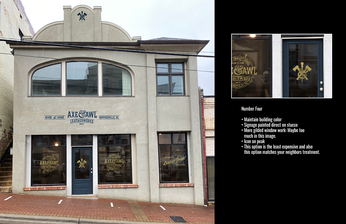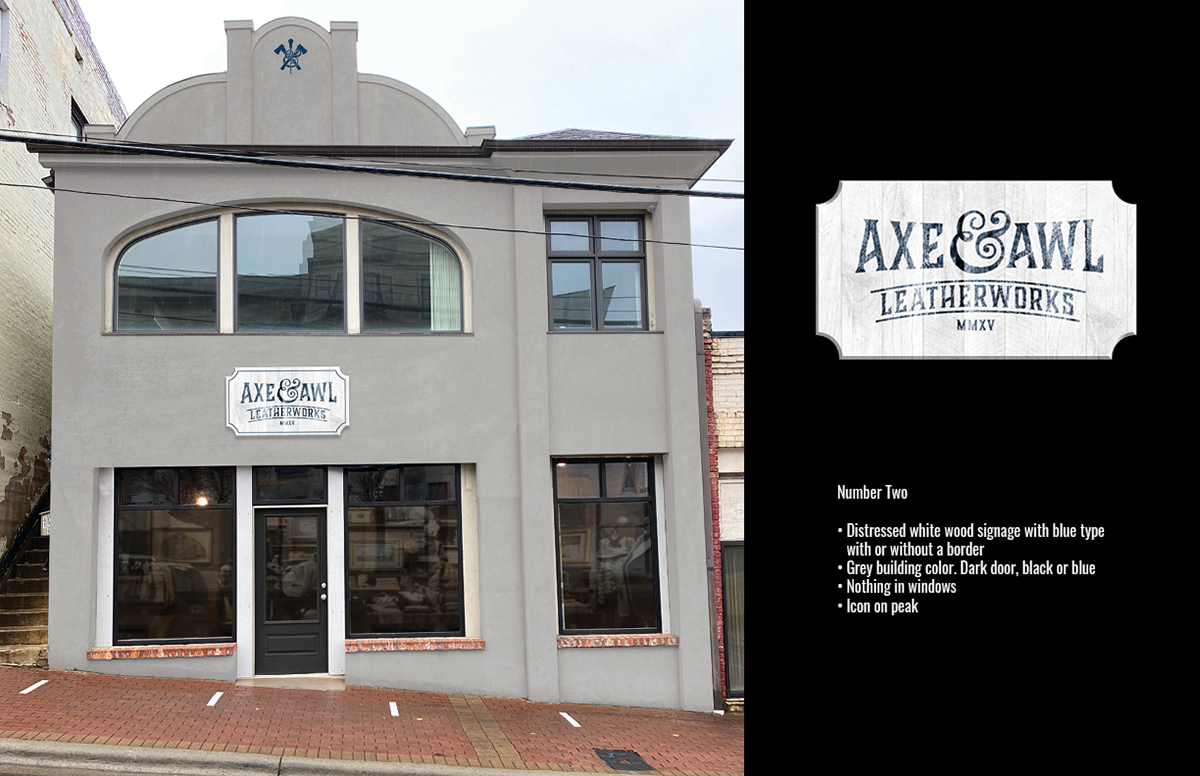When Axe & Awl Leatherworks purchased the building above they approached me about designing the exterior. This included developing marquee signage, projection signage, gilded window signage, body and trim paint colors, and a Trompe-l'œil version of their logo for the roof peak. The above image is the final product and below are the options I presented which included a variety of approaches that fit comfortably into the brand aesthetic I developed for them.