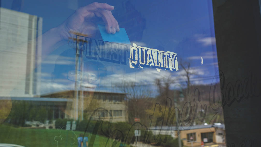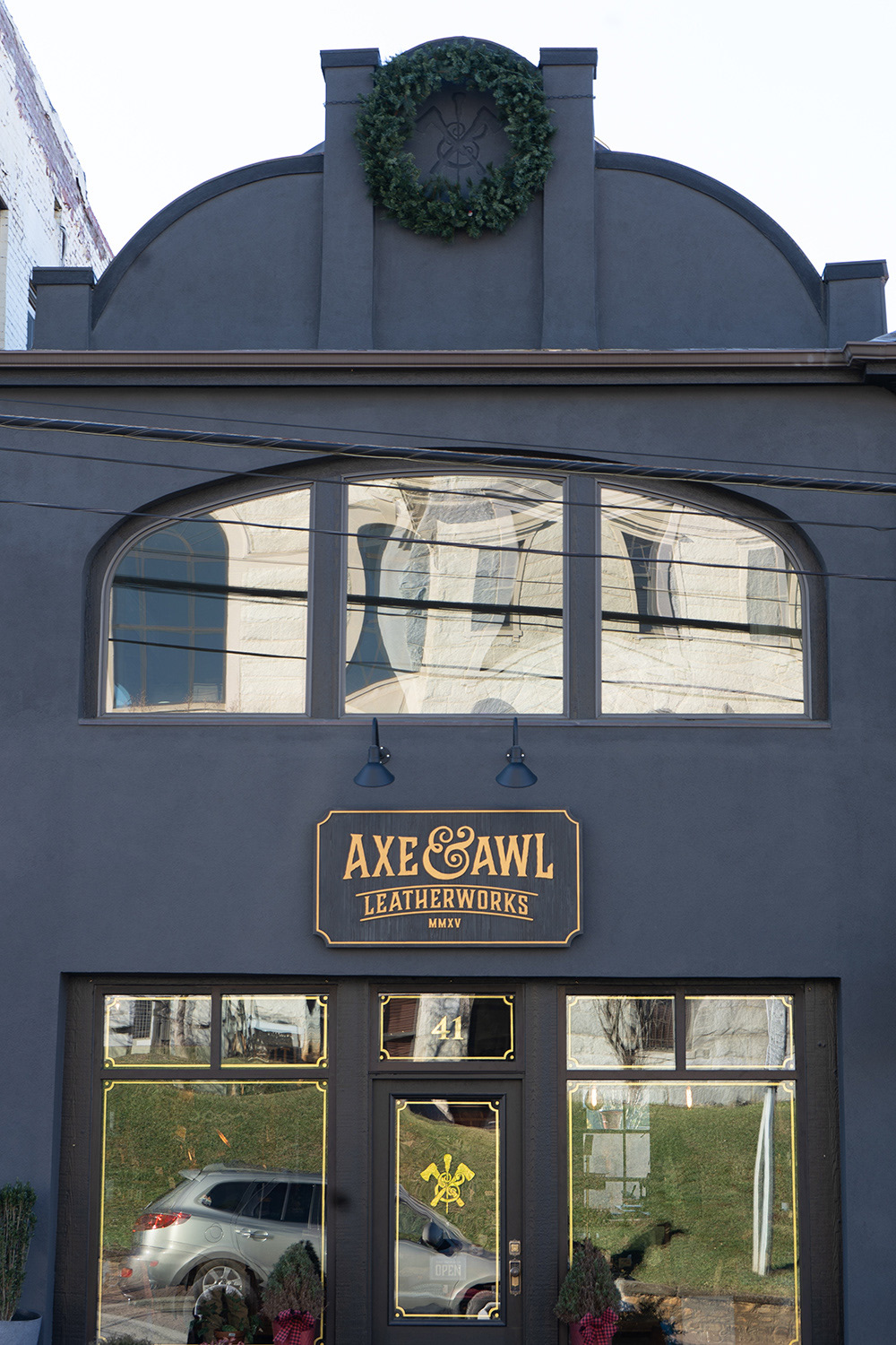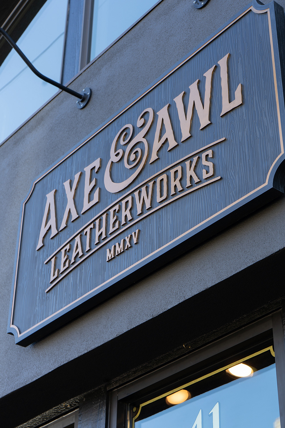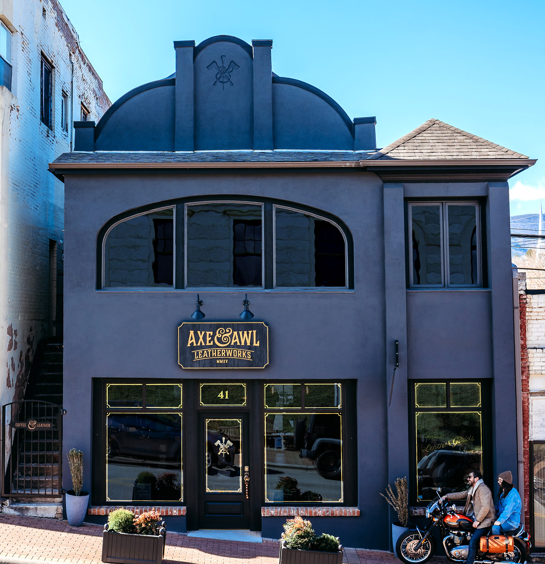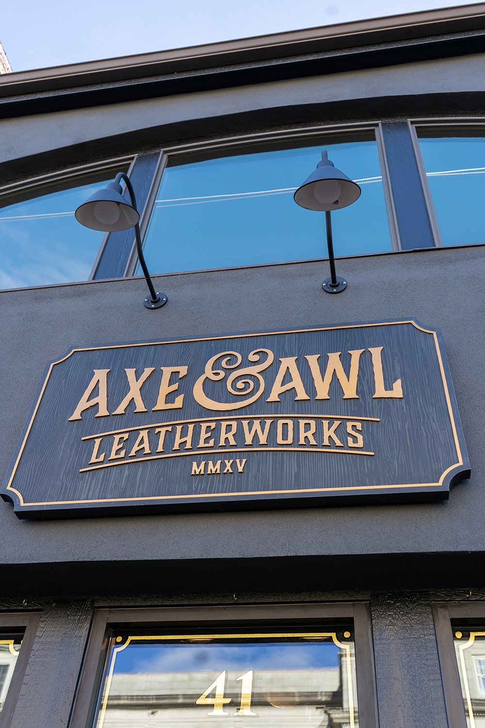 When Axe & Awl Leatherworks purchased the building above they approached me about designing the exterior. This included developing marquee signage, projection signage, gilded window signage, body and trim paint colors, and a Trompe-l'œil version of their logo for the roof peak. The above image is the final product and below are the options I presented which included a variety of approaches that fit comfortably into the brand aesthetic I developed for them.