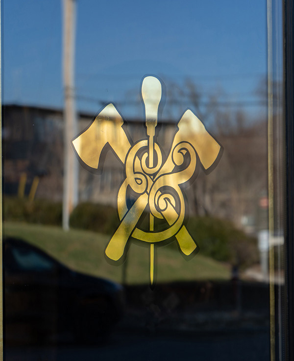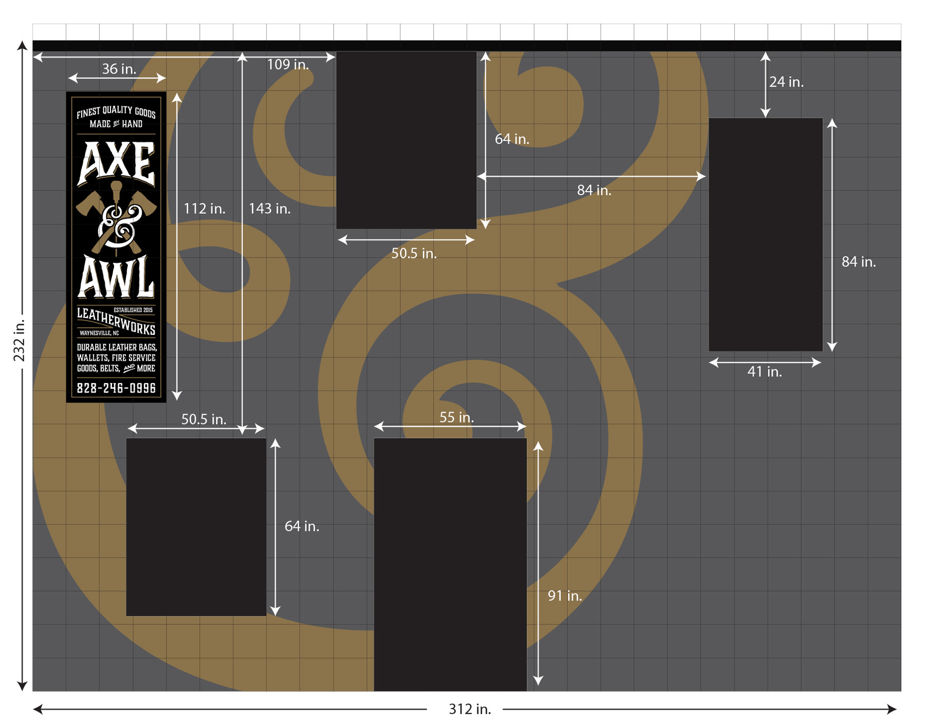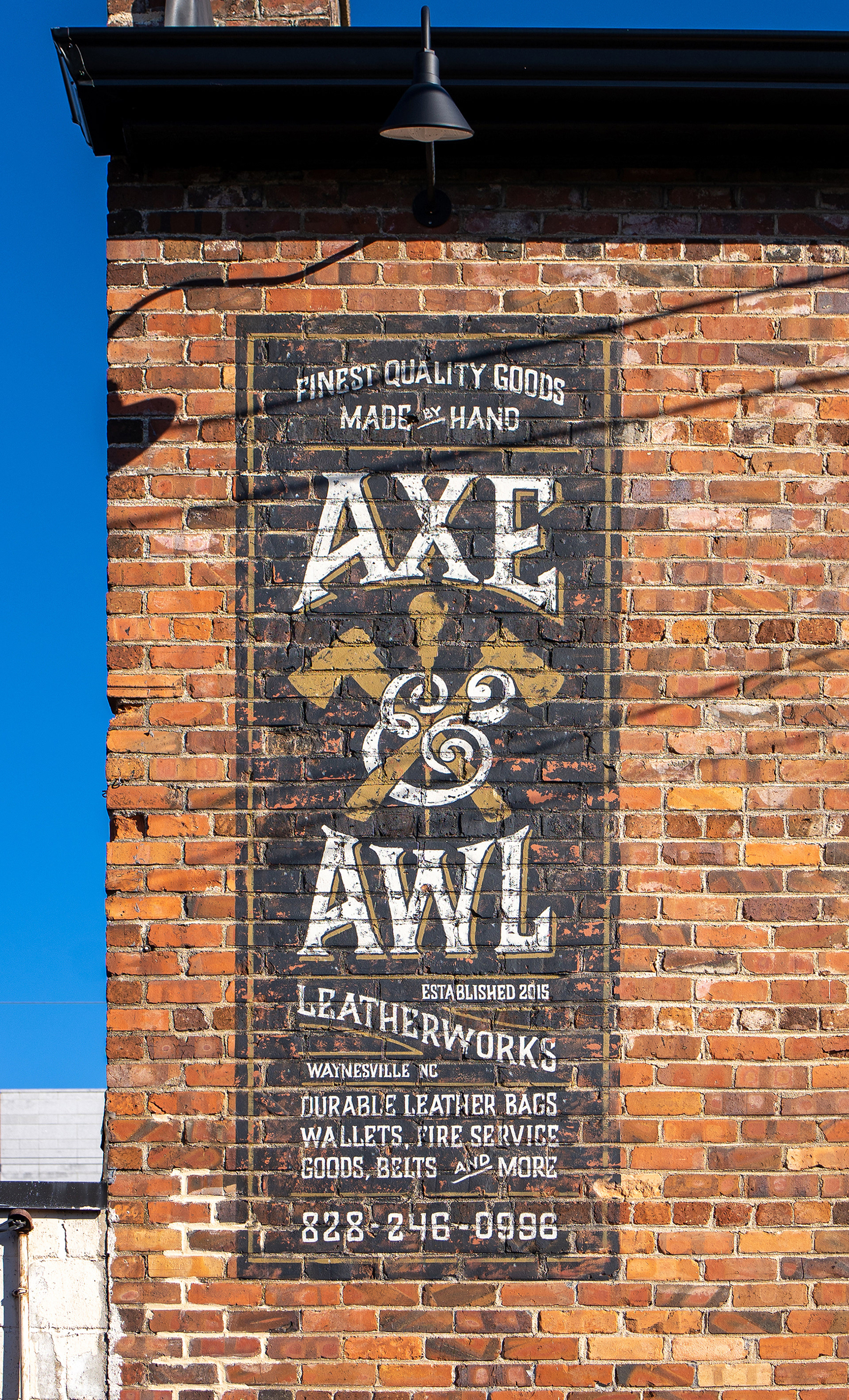 Below is the projection sign. I had an opportunity to work some of the branding elements into the locally fabricated steel bracket. Reworking the axe, awl, and ampersand elements into a fun, functional, and supportive bracket design was a really interesting challenge. The sign itself was hand painted by the same local artisan who did the others and features one of the brand extension logos I developed for this client. The arrow in this logo is a reference to a leather tannery that had been a large regional business in their town (Waynesville, NC) in the early part of the 20th century.