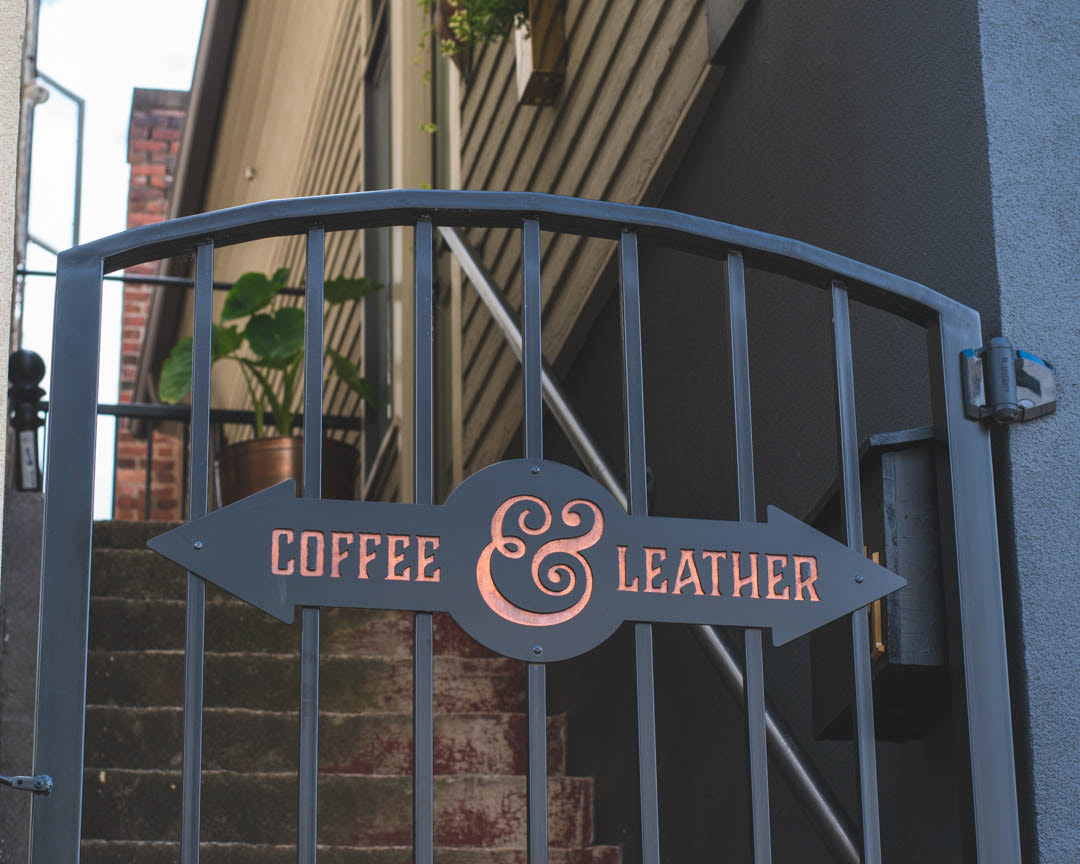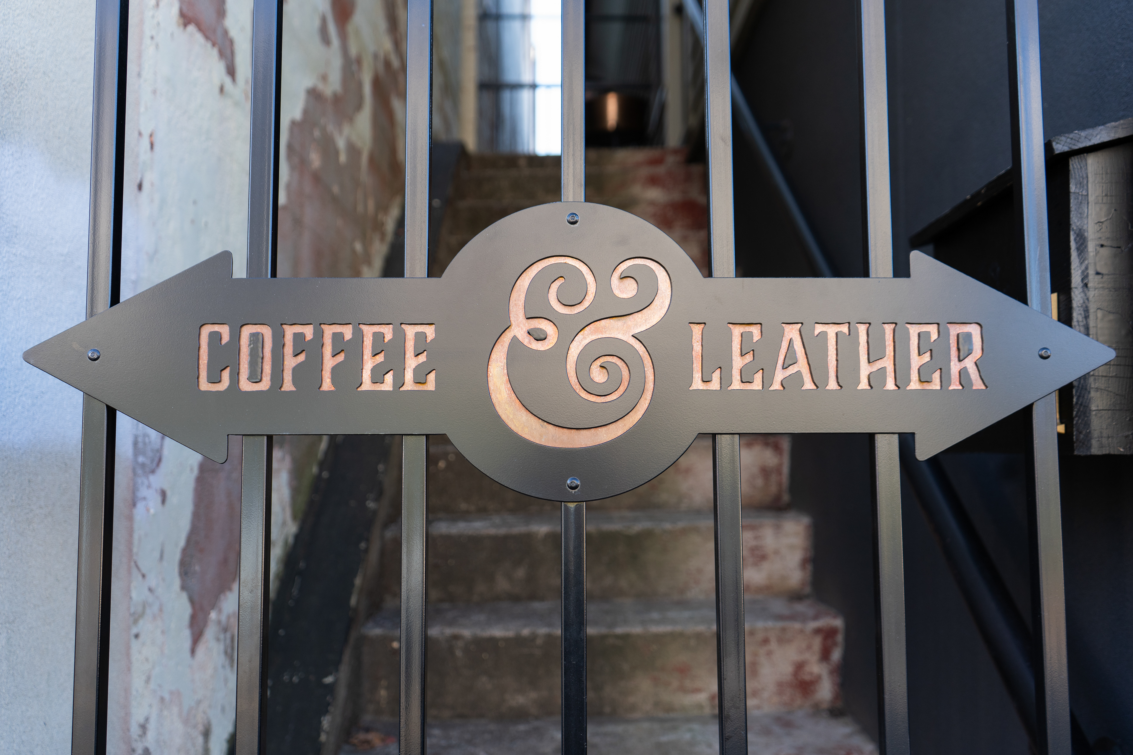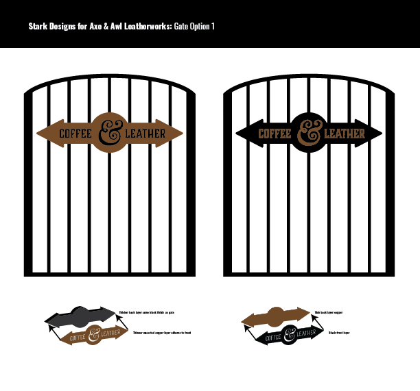 The sign below was designed for the gate on an alley between my client's leather store and their neighbor, a gourmet coffee shop. Since my client paid for it we utilized the ampersand and typography from their branding. Rather than painting the letters, I conceived of cutting them out of metal and sandwiching a layer of copper in the middle. My thought was that this will age really nicely. Uncoated copper turns a beautiful green shade known as verdigris (think Statue of Liberty).